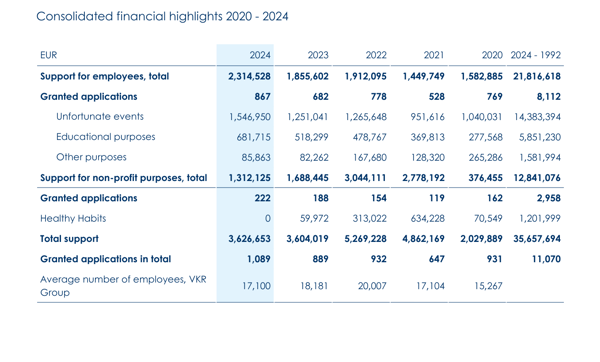 In 2024, we made grants worth EUR 3.6 million altogether. But already since 1992 the Employee Foundation has contributed to bettering the lives of our employees. Go back in time and view some of our financial highlights below.