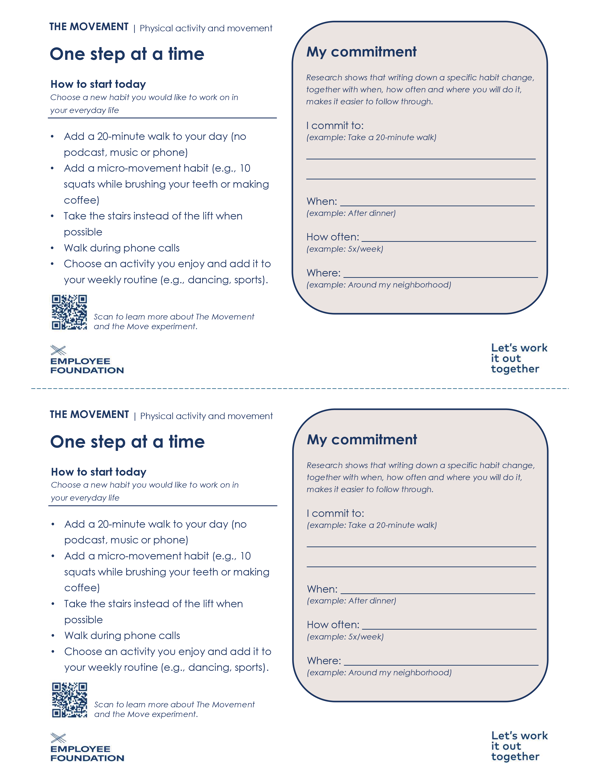 Download and print the commitment card and choose one new habit to work on in your everyday life. Write it down and keep it visible as a daily reminder. For extra motivation, share your card with colleagues, friends, or family—encouragement works best when you do it together.